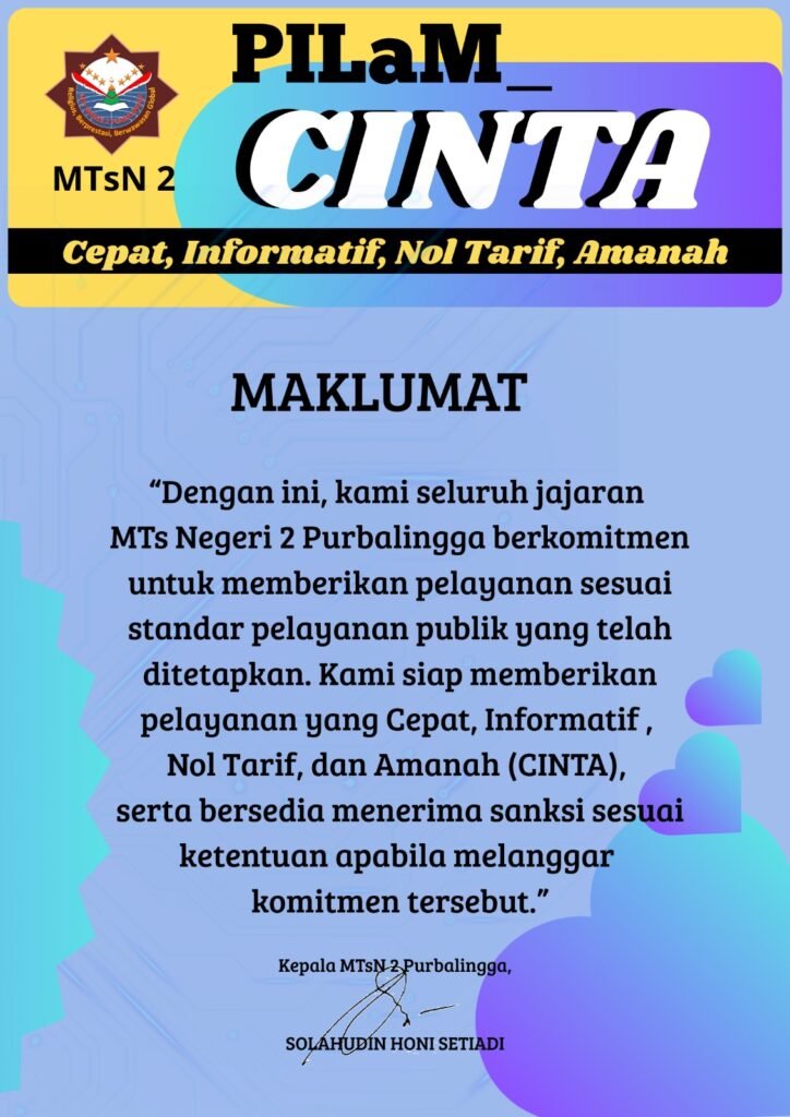 PILAM CINTA merupakan komitmen MTs Negeri 2 Purbalingga dalam menghadirkan layanan informasi dan pelayanan publik yang berorientasi pada kepuasan masyarakat serta menjunjung tinggi prinsip akuntabilitas. Cepat bermakna setiap layanan diberikan dengan responsif, tepat waktu, dan tidak berbelit-belit, sehingga masyarakat memperoleh kepastian layanan yang jelas.Informatif mencerminkan keterbukaan dalam penyampaian informasi yang akurat, mudah dipahami, dan dapat diakses oleh seluruh masyarakat. Melalui layanan yang informatif, PILAM menjadi sarana edukatif sekaligus media transparansi madrasah.